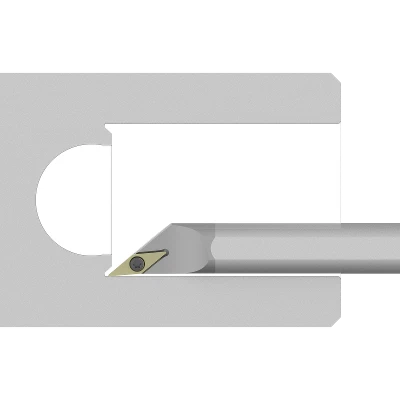 Diese linksschneidende Stahl-Bohrstange mit einem ⌀ 12.00 mm Zylinderschaft mit Spannfläche ist 125.00 mm lang und besitzt einen Kühlkanal direkt auf die Wendeplatte der Grösse VC0702 mit einem Einstellwinkel von 5.0°. Der Stahlschaft ist gehärtet und bietet so eine verbesserte Stabilität sowie reduzierte Vibrationen.