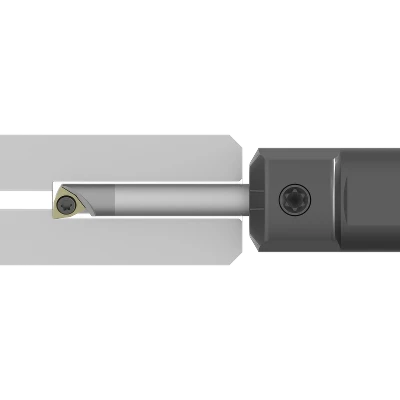 Diese rechtsschneidende Hartmetall-Bohrstange mit einem ⌀ 6.00 mm SynTool ist 60.40 mm lang und besitzt keinen Kühlkanal. Die Wendeplatte der Grösse WC0201 muss extern gekühlt werden (Einstellwinkel: 93.0°). Im Vergleich zu einem gehärteten Stahlschaft bietet der Hartmetallschaft eine deutlich höhere Schwingungsdämpfung, was zu einer verbesserten Oberflächengüte und längerer Werkzeugstandzeit führt.