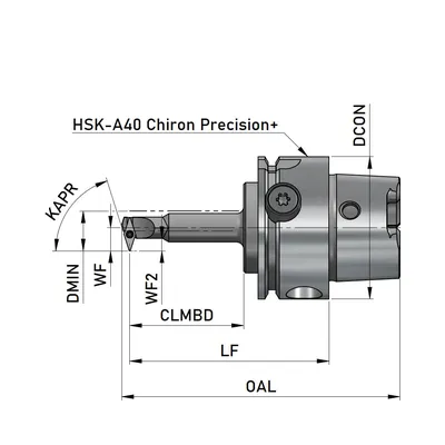 Die Schnittstelle ist ein HSK-A40 CHIRON with Precision⁺. Die HSK-Schnittstelle sorgt für eine hochpräzise, steife und formschlüssige Verbindung, die maximale Wiederholgenauigkeit, hohe Drehmomentübertragung und optimale Stabilität bei der Zerspanung gewährleistet.